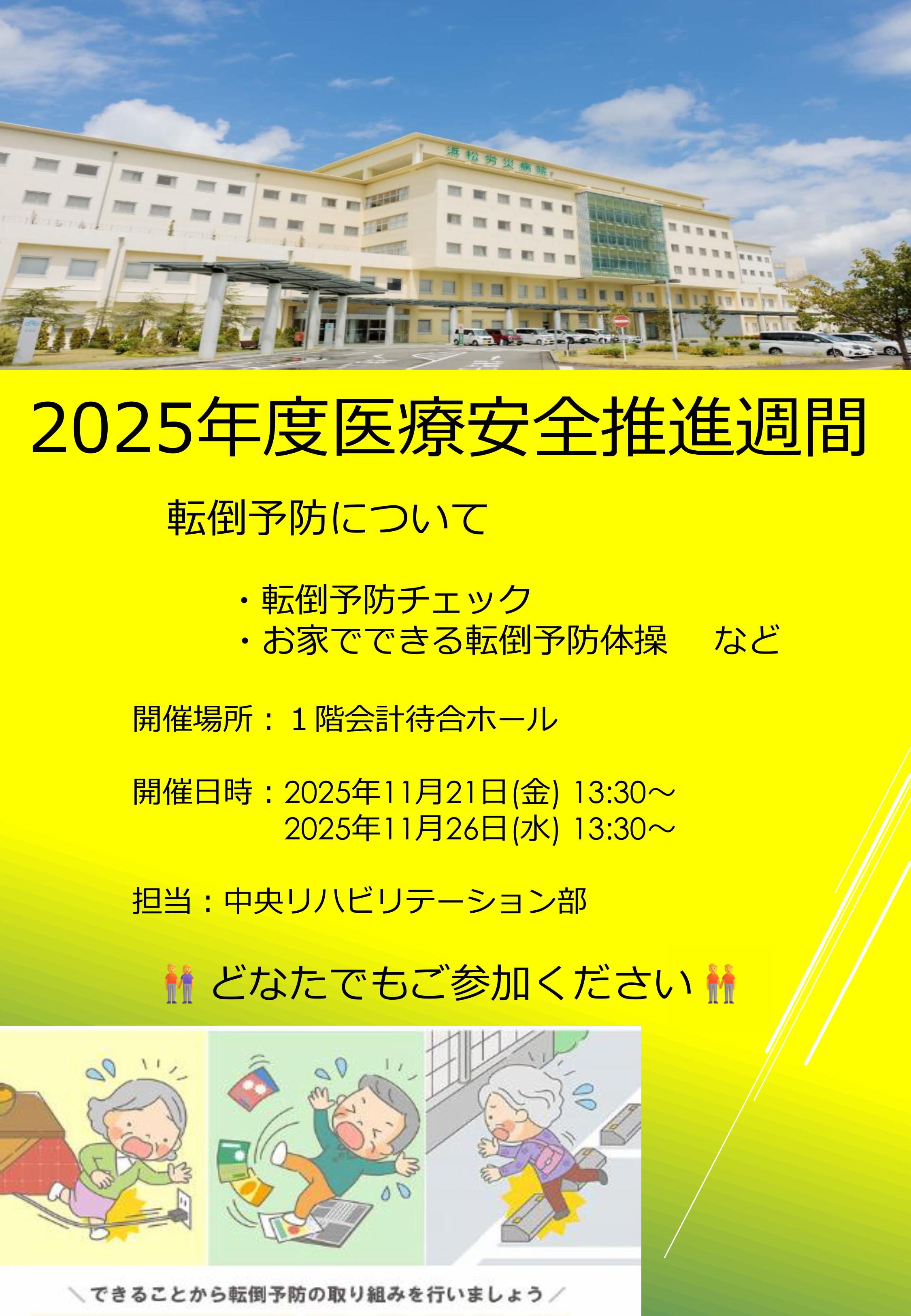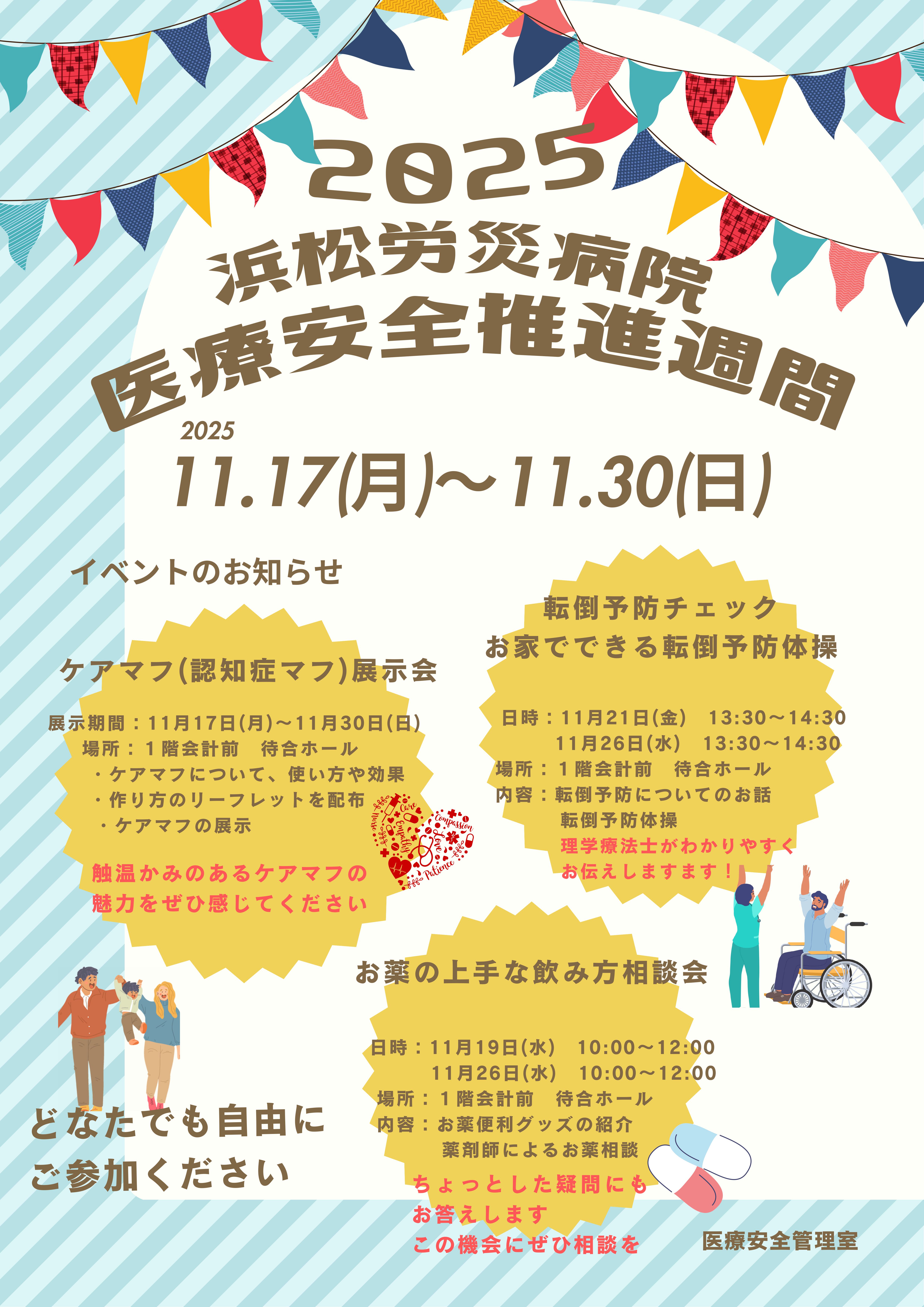 2025.11.07 患者さん 医療安全推進週間 イベント開催のお知らせ 11月17日~30日を医療安全推進週間として、院内で推進イベントを開催します。どなたでもご参加いただけます。ぜひお越しください。 ※以下の画像はクリックしていただくと拡大表示が可能です。 一覧へ戻る 2025.10.07 ろうさいニュース(10月号)発行しました 2025.10.01 看護助手(嘱託)募集のご案内 2025.09.29 インフルエンザワクチン予防接種のご案内について 2025.09.25 第65回浜松EAST医療連携セミナーを開催いたします 2025.09.18 「休日女性がん検診」のご案内 2025.09.01 ろうさいニュース(9月号)発行しました 2025.08.13 ろうさいニュース(8月号)発行しました 2025.08.12 治療と仕事の両立支援セミナー開催のお知らせ 2025.07.11 ろうさいニュース(7月号)発行しました 2025.07.07 2025第2回はままつ健康フォーラムのお知らせ 2025.06.30 ろうさいニュース(6月号)発行しました 2025.05.30 「休日女性がん検診」開催のお知らせ 2025.05.29 資料のAI音声読み上げに「Vioce Gate」を導入しまし... 2025.05.14 ろうさいニュース(5月号)発行しました