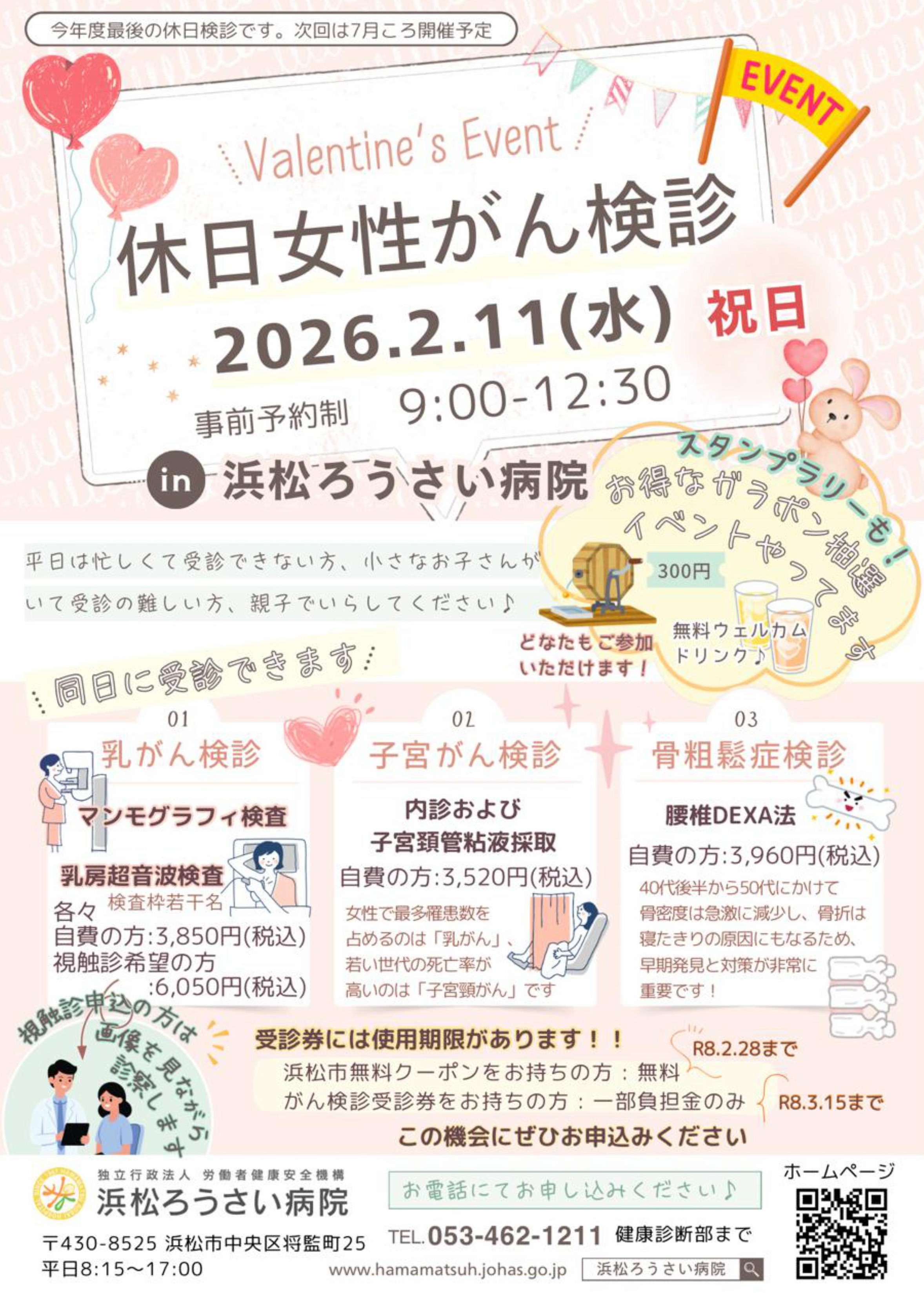 2025.11.20 患者さん 医療関係者の方 「休日女性がん検診」のご案内 ※以下の画像はクリックしていただくと拡大表示が可能です。 一覧へ戻る 2025.11.07 医療安全推進週間 イベント開催のお知らせ 2025.11.05 病院紹介動画を作成いたしました 2025.10.07 ろうさいニュース(10月号)発行しました 2025.10.01 看護助手(嘱託)募集のご案内 2025.09.29 インフルエンザワクチン予防接種のご案内について 2025.09.25 第65回浜松EAST医療連携セミナーを開催いたします 2025.09.18 「休日女性がん検診」のご案内 2025.09.01 ろうさいニュース(9月号)発行しました 2025.08.13 ろうさいニュース(8月号)発行しました 2025.08.12 治療と仕事の両立支援セミナー開催のお知らせ 2025.07.11 ろうさいニュース(7月号)発行しました 2025.07.07 2025第2回はままつ健康フォーラムのお知らせ 2025.06.30 ろうさいニュース(6月号)発行しました 2025.05.30 「休日女性がん検診」開催のお知らせ