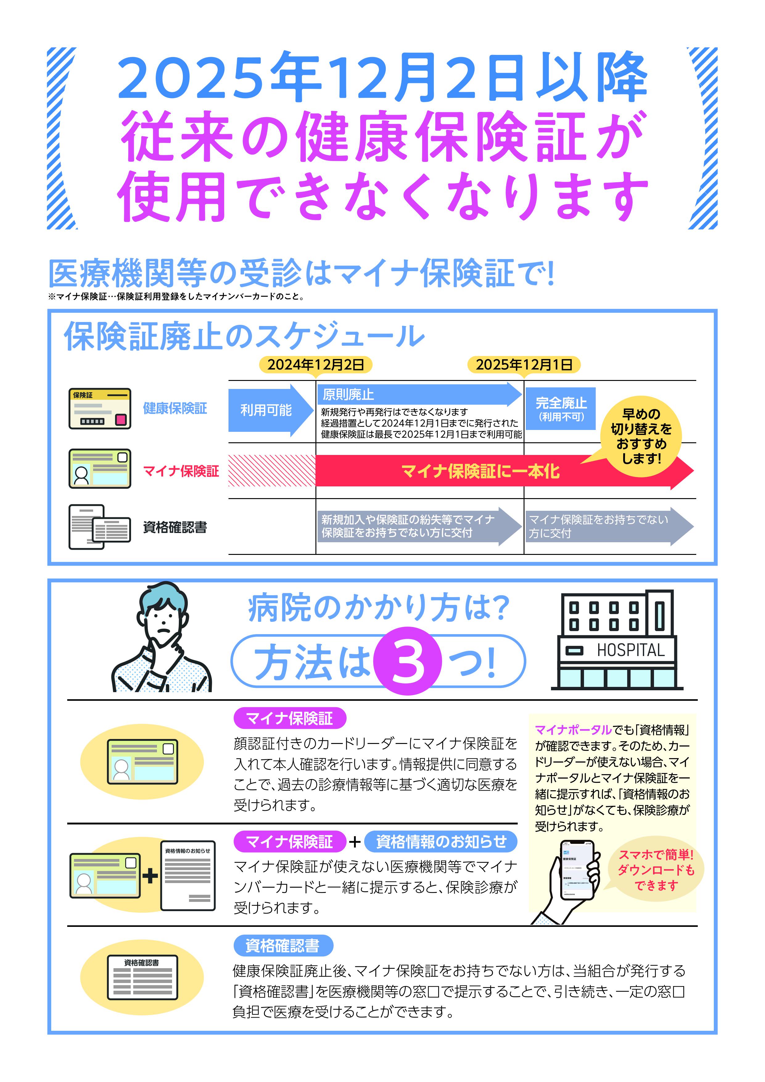2025.11.27 患者さん 2025年12月2日以降 従来の健康保険証が使用できなくなります 2025年12月2日以降、従来の健康保険証が使用できなくなります。受診の際には、マイナ保険証あるいは資格確認書をお持ちください。※以下の画像はクリックしていただくと拡大表示が可能です。 一覧へ戻る 2025.11.20 「休日女性がん検診」のご案内 2025.11.20 ろうさいニュース(11月号)発行しました 2025.11.07 医療安全推進週間 イベント開催のお知らせ 2025.11.05 病院紹介動画を作成いたしました 2025.10.07 ろうさいニュース(10月号)発行しました 2025.10.01 看護助手(嘱託)募集のご案内 2025.09.29 インフルエンザワクチン予防接種のご案内について 2025.09.25 第65回浜松EAST医療連携セミナーを開催いたします 2025.09.18 「休日女性がん検診」のご案内 2025.09.01 ろうさいニュース(9月号)発行しました 2025.08.13 ろうさいニュース(8月号)発行しました 2025.08.12 治療と仕事の両立支援セミナー開催のお知らせ 2025.07.11 ろうさいニュース(7月号)発行しました 2025.07.07 2025第2回はままつ健康フォーラムのお知らせ